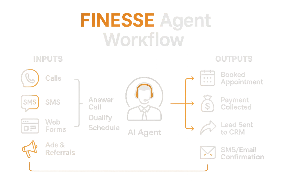 FINESSE AI Agents are advanced, voice- and chat-enabled virtual assistants that handle booking, sales, and follow-up across phone, SMS, chat, and social — available 24/7 to keep your business running without missed opportunities.